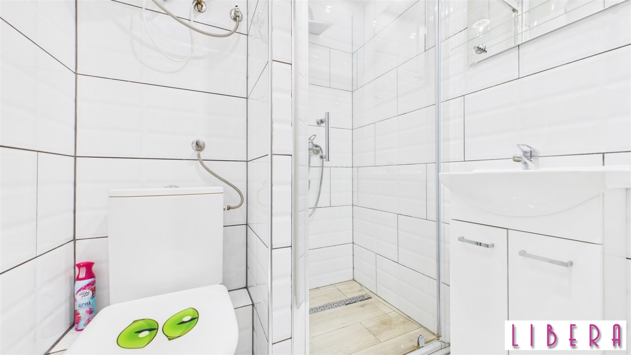 Nowoczesna łazienka wykończona w jasnych, eleganckich płytkach. Jest tu kabina prysznicowa z przeszkleniem, toaleta oraz umywalka z szafką. Zainstalowano bojler zapewniający ciepłą wodę.