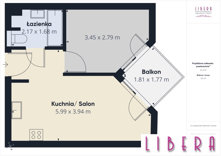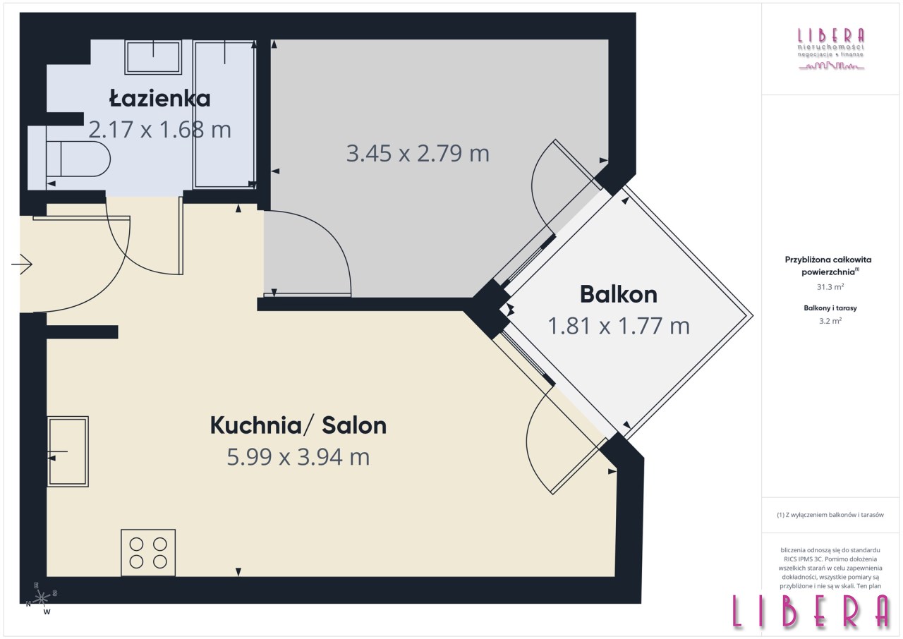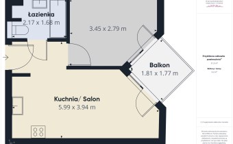 Decydując się na zakup nabędziesz lokal o powierzchni 31,40m2, w której skład wchodzi salon z aneksem (17,06m2), sypialnia (8,31m2),przedpokój (1,84m2), łazienka z wc (3,79m2) i balkon (1,93m2).