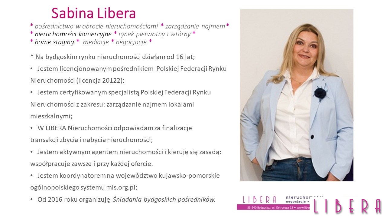 LIBERA Nieruchomości Sabina Libera – jestem członkiem Polskiej Federacji Rynku Nieruchomości (PFRN) i Wielkopolskiego i Warszawskiego Stowarzyszenia Pośredników w Obrocie Nieruchomościami (WSPON).