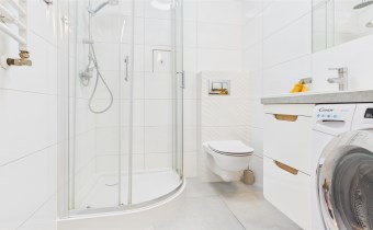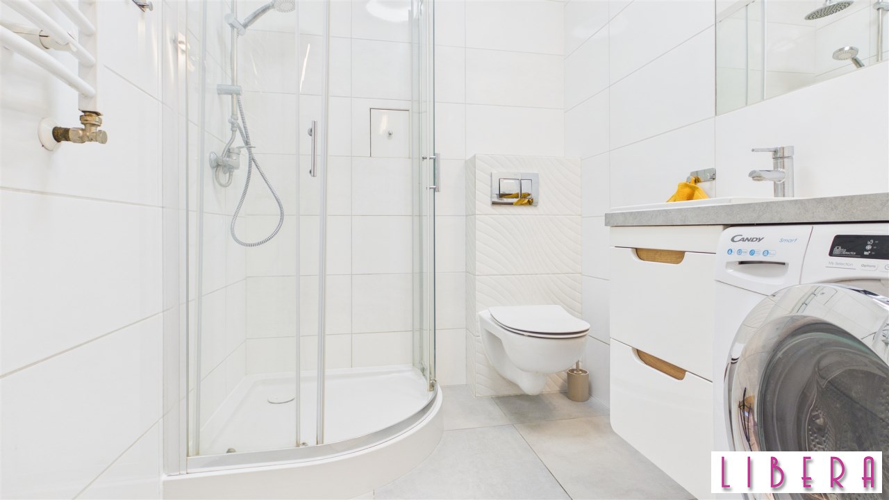 * łazienka z wc (kabina prysznicowa, pralka, grzejnik drabinkowy),