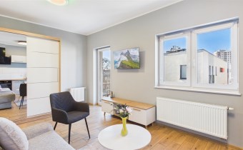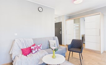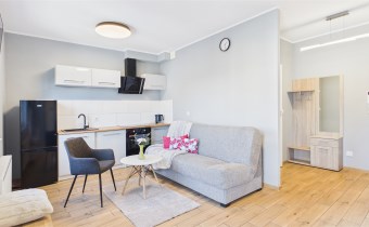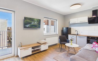 * pokój (nowa kanapa, stolika kawowy i fotel, szafka RTV, tv, szafa) z wyjściem na balkon i aneksem kuchennym(meble w zabudowie, podstawowy sprzęt AGD),