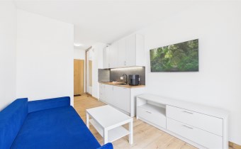 * pokój dzienny z kanapą, szafka RTV, z aneksem kuchennym (meble w zabudowie, sprzęt AGD, zmywarka),