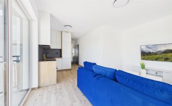 * pokój dzienny z kanapą, szafka RTV, z aneksem kuchennym (meble w zabudowie, sprzęt AGD, zmywarka),