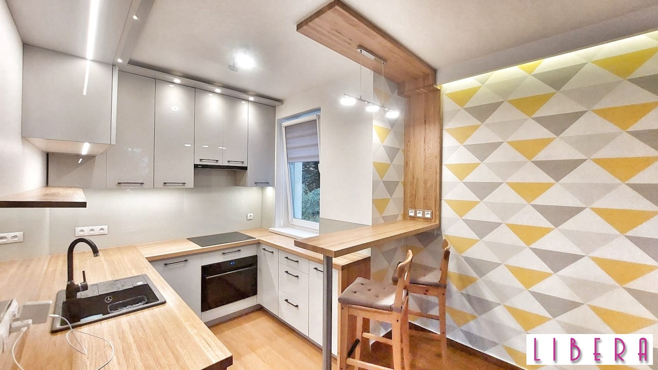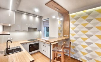 - wyposażony w sprzęt AGD aneks kuchenny (6m2) oddzielony od części dziennej wyspą, która pełni funkcję stołu,